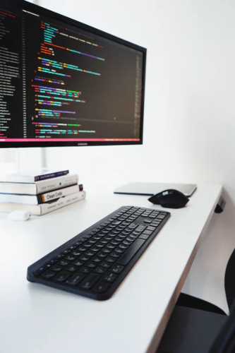 employee is working on his computer at work, from home.